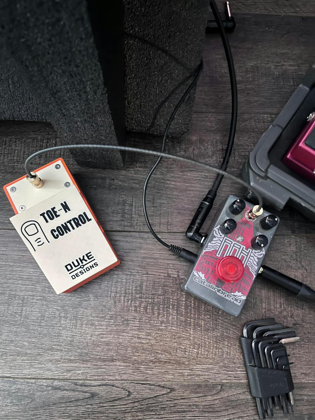 The Toe-N Control boasts a compact design that matches the size of a standard guitar pedal rather than a full expression pedal, making it a versatile and space-saving addition to your setup and easy to add to a pedal board. Compatible with standard 6mm and 1/4" potentiometers, the cable to pedal attachment aims to work with the majority of pedals. Plus, with an included hex wrench conveniently stored underneath, you'll have everything you need to experiment and customize your sound. Unleash your creativity with the Toe-N Control today!